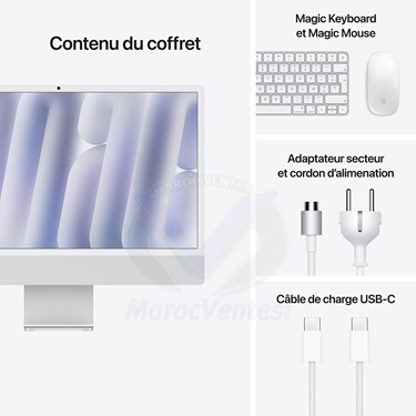 Processeur : Apple M4 (8 cœurs CPU / 8 cœurs GPU / Neural Engine 16 cœurs)Mémoire RAM : 16 GoStockage : SSD 256 GoÉcran : 24 pouces – 4480 x 2520 px – RetinaWi-Fi 6E / Bluetooth 5.3Accessoires inclus : Clavier + SourisClavier : AZERTY – FrançaisConnectiques : 2 x USB-C Thunderbolt 4 + Jack 3.5mmSystème : macOS SequoiaCouleur : ArgentMatériau : AluminiumDimensions (L x H x P) : 547 x 461 x 147 mmGarantie : 1 ans - Plus d'images (2)