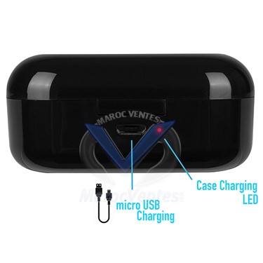 - Le boîtier de chargement est équipé d'une batterie de 300 mAh capable de charger complètement les écouteurs à deux reprises, ce qui permet d'écouter 15 heures de musique