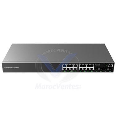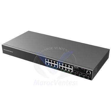 Les appareils de la série GWN7800 sont des commutateurs de réseau administré niveau 2+ qui permettent aux petites et moyennes entreprises de créer des réseaux évolutifs, sécurisés, performants et intelligents, entièrement administrables. Ils prennent en charge les protocoles VLAN avancés pour une segmentation flexible et sophistiquée du trafic, la qualité de service avancée pour établir les priorités du trafic réseau, la fonction Snooping IGMP pour optimiser les performances du réseau, ainsi que des capacités de sécurité polyvalentes contre les attaques potentielles. Les modèles PoE offrent une alimentation de sortie PoE dynamique pour alimenter les téléphones IP, les caméras IP, les points d’accès Wi-Fi et les autres appareils PoE. La série GWN7800 peut être gérée de plusieurs façons, y compris l’interface utilisateur Web du commutateur de la série GWN7800. La série est également prise en charge par GWN. Cloud et GWN Manager, les plateformes de gestion Wi-Fi du nuage et sur site de Grandstream. Les appareils de la série pour entreprises GWN7800 sont les commutateurs de réseau administré idéaux pour les petites et moyennes entreprises.- Ports Ethernet 8/16/24 - Gigabit et ports SFP 2/4 - Gigabit- Contrôle intelligent de l’alimentation pour prendre en charge la distribution dynamique de l’alimentation PoE/PoE+ par port pour les modèles PoE- Prise en charge du déploiement sur les réseaux IPv6 et IPv4- Inspection ARP, IP Source Guard, protection contre les dénis de service, sécurité des ports et snooping DHCP- Interface utilisateur Web locale; GWN. Cloud et GWN Manager, plateforme de gestion du nuage informatique de Grandstream et du Wi-Fi sur les lieux.- Fonction qualité de service intégrée pour organiser les priorités du trafic réseau.Caractéristiques TechniquesPorts Ethernet 16 ports GigabitPorts SFP 4 ports GigabitCapacité de commutation 40 Gbit/sDébit total non bloquant 20 Gbit/sVitesse de transfert 29,76 MppsMode de transfert Enregistrer et transférerAlimentation électrique (GWN7802) 30WAlimentation électrique (GWN7802P) 270WPuissance PoE totale (GWN7802P) 240W maximumNormes PoE (GWN7802P) IEEE 802.3af/atProtection contre les surtensions ±6KV CM et DM pour l'alimentation, ±4KV CM pour les ports réseauDimensions 440 mm (L) x 200 mm (l) x 44 mm (H)Protocoles réseau IPv4, IPv6, IEEE 802.3, IEEE 802.1Q, IEEE 802.1p, IEEE 802.1wTempérature de fonctionnement 0°C à 45°CMontage Bureau, mur ou rack (support inclus)