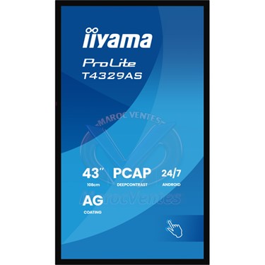 Écran interactif PCAP tout-en-un de 43 pouces pour espaces de collaboration intelligentsLe ProLite T4329AS-B1AG est un écran tactile PCAP tout-en-un de 43 pouces conçu pour répondre aux besoins évolutifs des espaces de travail modernes, en particulier les espaces de réunion informels où la créativité, la flexibilité et le partage fluide sont au cœur des préoccupations.Fonctionnant sous Android, cet écran interactif offre une expérience utilisateur intuitive et hautement adaptable. Vous pouvez installer vos applications préférées directement sur l'appareil, ce qui permet de personnaliser les flux de travail selon votre environnement : espace de réunion collaboratif, centre d'innovation d'entreprise ou salle de formation.La fonction de boucle USB-C simplifie la connectivité en permettant de connecter plusieurs écrans en série tout en transmettant l'alimentation, les données et la vidéo, le tout via un seul câble. Cela réduit l'encombrement des câbles et le temps d'installation, ce qui est idéal pour les espaces de travail dynamiques. Le support mural inclus assure une installation simple et sécurisée.Avec iiSignage² (CMS), iiControl (GED) et iiShare (Présentation sans fil), vous maîtrisez pleinement le contenu et la messagerie, même à distance : idéal pour mettre à jour instantanément les informations partagées ou les visuels de votre marque. L’ application EShare intégrée facilite le partage d’écran et la collaboration sans fil, permettant l’interaction entre plusieurs utilisateurs et la génération d’idées en temps réel.Le T4329AS-B1AG n'est pas qu'un simple écran, c'est un outil de collaboration conçu pour renforcer les équipes, simplifier la communication et optimiser chaque réunion.SPECIFICATIONSCARACTÉRISTIQUES D'AFFICHAGE