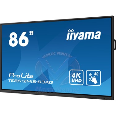 IIYAMA PROLITE TE8612MIS-B3AG + UC-CAM10PRO-1Écran 86 pouces 4K Ultra HD, 3840 x 2160 pixelsSystème d'exploitation sous Android 11Revêtement antireflet pour une meilleure visibilitéConnectivité étendue: 4 HDMI, Wifi, USB, LAN, USB-CPartage d'écran sans fil via appli ou bouton optionnelCompatible montage VESA, flexibilité d'installationHaut-parleurs intégrés face avant, son clair et puissantEmplacement pour mini PC format OPS (en option)Idéal pour intégrer un second OS sous WindowsSÉCURITÉ