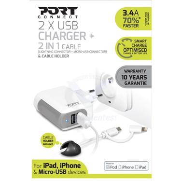 Le WALL + CAR CHARGER 2 USB + 2-IN-1 est un pack contenant un chargeur mural pour appareil électronique (Smartphone, tablette, GPS, etc.), un chargeur allume-cigare, un câble USB avec connecteur 2 en 1 (Micro USB + Lightning) de 1,2 mètres et un range câble adhésif. - Plus d'images (2)