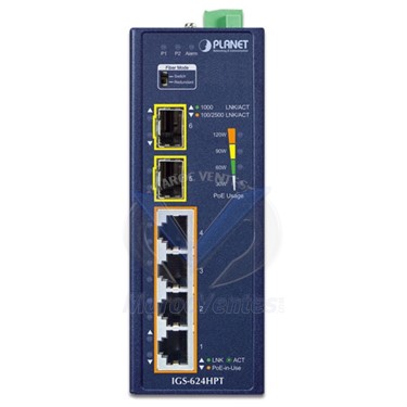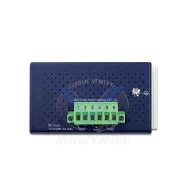 Commutateur Ethernet industriel 4 ports 10/100/1000T 802.3at PoE + 2 ports 100/1000/2500X SFP Sur Commande 4 à 5 semaines Description du ProduitSolution d'alimentation PoE+ complète et économique, idéale pour les environnements difficilesDoté de la technologie Plug and Play conçue pour être installée dans des environnements industriels lourds, l'IGS-624HPT est un commutateur Gigabit Ethernet PoE+ non géré de type rail DIN de qualité industrielle PLANET avec quatre ports 10/100/1000BASE-T dotés de la norme IEEE 802.3at PoE+ et deux interfaces fibre optique SFP 100/1000/2500BASE-X supplémentaires pour la connexion montante.Doté d'un système d'alimentation redondant, l'IGS-624HPT assure un fonctionnement fiable, stable et silencieux dans tout environnement sécurisé, sans impact sur ses performances. Il offre une puissance totale allant jusqu'à 120 watts pour différents types d'applications PoE et une plage de températures de fonctionnement comprise entre -40 et 75 °C, le tout dans un boîtier métallique robuste IP40.Système d'alimentation pratique et fiablePour faciliter l'utilisation du PoE+ 802.3at avec une alimentation 12~54 V CC courante pour les applications industrielles et de transport, l'IGS-624HPT adopte la technologie Power Boost de 12~54 V CC à 54 V pour résoudre les problèmes d'alimentation, sans nécessiter d'alimentation spécifique. L'IGS-624HPT offre une solution d'alimentation intégrée avec une large plage de tensions (12~54 V CC) pour une utilisation dans le monde entier. Il dispose également d'entrées d'alimentation 12~54 V CC à double redondance et polarité réversible pour les applications à haute disponibilité.Mode de commutation réglable à 6 ports ou mode redondant à 4 + 2 fibresGrâce à son commutateur DIP intégré, l'IGS-624HPT peut être configuré en commutateur Gigabit Ethernet 6 ports ou en mode redondant 4+2 fibres. En mode 6 ports Gigabit, l'IGS-624HPT peut fonctionner en mode stockage et retransmission avec des performances élevées. En mode redondant 4+2 fibres, il assure une redondance rapide de la liaison fibre pour les applications Ethernet hautement critiques. Ce mode redondant prend également en charge la fonction de récupération automatique. Si le port de destination d'un paquet est déconnecté, le paquet est transféré vers l'autre port de la paire de secours.Caractéristiques TechniquesInterface4 ports cuivre RJ45 Gigabit Ethernet 10/100/1000BASE-TDeux emplacements SFP, prenant en charge les émetteurs-récepteurs 1000/2500BASE-X et 100BASE-FX en modes doubles (détection automatique)