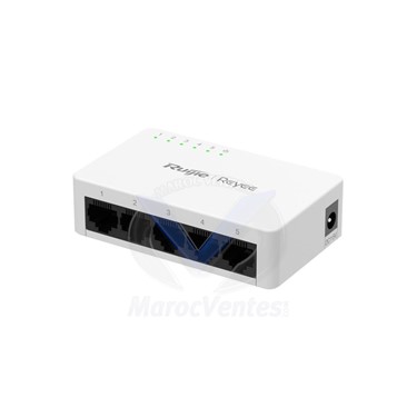 Marque ReyeeInterfaces 5 x 10/100/1000BASE-T (RJ45)Vitesse par port 10/100/1000 Mbps (auto-négociation)Capacité de commutation 10 GbpsDébit de transfert 7,44 MppsTable MAC 2KTechnologies prises en charge Auto-Négociation / Auto MDI/MDIXAlimentation Adaptateur DC externe 5 V / 1 AConsommation max. 2,1 WTempérature de fonctionnement 0 °C ~ 40 °CDimensions (L x P x H) 85 x 52 x 23,5 mmPoids 0,22 kgBoîtier Plastique mat (format bureau) • FanlessGestion Non géré (unmanaged) • non administrableNombre de ports 1 – 8 (catégorie) • modèle 5 portsPoE Non (Power over Ethernet non pris en charge)Protection surtension 4 kVCompatibilité Cloud Aperçu via Ruijie Cloud (si un switch managé est présent sur le réseau) - Plus d'images (3)