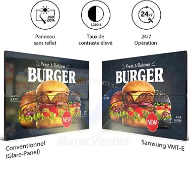 Samsung LH55VMTEBGB. Taille de l'écran: 139,7 cm (55"), Résolution de l'écran: 1920 x 1080 pixels, Luminosité de l'écran: 500 cd/m². Conception du produit: Panneau plat de signalisation numérique, Couleur du produit: Noir, Installation prise en charge: Intérieure. Utilité: Commercial, horaires de service (heures/jours): 24/7. Consommation électrique typique: 242 W, Consommation d 'énergie (en mode veille): 0,5 W, Tension d'entrée AC: 100/240 V. Largeur: 1211,5 mm, Profondeur: 682,3 mm, Hauteur: 70 mm.Cet écran présente une esthétique parfaite sous tous les angles. Qu'il soit éteint ou allumé, son design lui permet de se fondre parfaitement dans n'importe quel intérieur.Avec ses lignes fluides et raffinées, ce téléviseur apportera une touche d'élégance à votre intérieur, où que vous le placiezSpécifications
