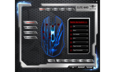 Grâce au logiciel dédié, vous pourrez sauvegarder jusqu'à 5 profils différents en fonction de vos besoins. L'interface permet de gérer le rôle de chaque bouton (jusqu'à 13 en mode Shift), la résolution du capteur et bien évidemment le rétro-éclairage.