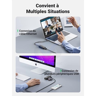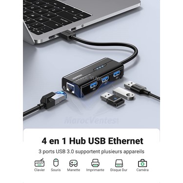 Adaptateur Ugreen HUB USB 3.0 vers 3 Ports USB 2.0 RJ45