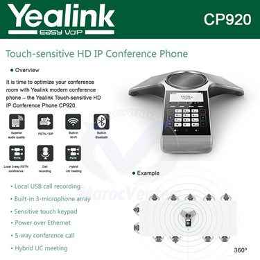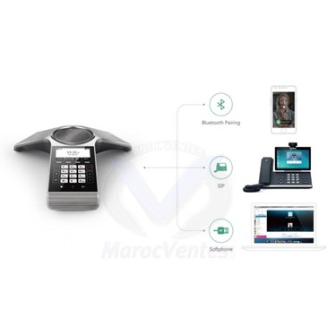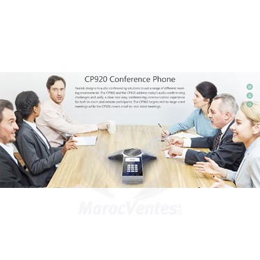 Son HD OptimaLe téléphone de conférence Yealink CP920 intègre la technologie HD Optima, le full duplex et l’annulation de l’écho acoustique. Les performances de communication sont optimales pour tous les utilisateurs qu’ils soient dans la salle ou à distance.Captation du son à 360°En intégrant trois microphones, le Yealink CP920 offre une prise de son à 360° et jusqu’à 3 mètres. Il est possible d’étendre la couverture en ajoutant deux micro supplémentaires.Conférence étendueLe Yealink CP920 gère des conversations accueillant jusqu’à cinq interlocuteurs. Ceci améliore significativement la communication entre des interlocuteurs situés dans différentes régions.Enregistrement des conversationsIl est très facile d’enregistrer les conférences téléphoniques en branchant tout simplement une clé USB sur le Yealink CP920.Connexion intégrée aux téléphones mobiles ou ordinateursIl est possible de connecter un téléphone mobile ou un ordinateur au CP920 pour partager la conférence téléphonique.DimensionsHauteur : 66,9mmLargeur : 307,8mmProfondeur : 298,5mmProtocoles VoIPSIP IP CentrexCodecsG.711a / μG.729aDHCPActivé (autoconfiguration IP)la communicationConférence à 5 interlocuteursRéseauEthernet 1 port RJ45 10/100 MbpsAlimentationPOE via RJ45 ou alimentation secteurConnectivité1 port USB 2.02 ports MIC EX (compatible avec le microphone Yealink CPE80)1 port téléphone mobile/PC : 3,5 mmDans votre colis1 téléphone Yealink CP9201 câble réseau Ethernet RJ45 compatible PoE de 7,5 m1 notice de démarrage rapide - Plus d'images (5)
