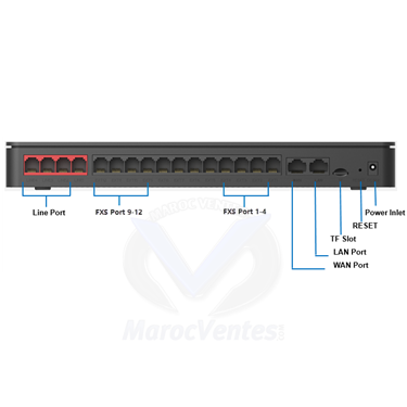 8 utilisateurs VOIP8 appels simultanés4 lignes téléphoniques VoIP8 portes fixes FXS4 ports FXS personnalisablesJusqu'à 4 FXO / BRI / ports personnalisablesJusqu'à 2 ports GSM / 3G / 4G personnalisables1 10 / 100Mbps LAN1 10 / 100Mbps WANCarte TF à fenteProtocole : SIP, IAX2Protocole de transport : UDP, TCP, TLS, SRTPDTMF : In-band, RFC4733, SIP INFOCodec G711 (alaw / ulaw), G722, G726, G729, GSM, Speex, ADPCM, iLBC, H263, H263P, H264, MPEGAlimentation : DC 12V 1ADimensions (cm) : 16 x 16 x 16 x 3Poids : 0,3Faible consommation d'énergie : 1,8-59,1 wattsLangues disponibles : portugais, anglais, espagnol, italien, chinois et russe.Services possibles: Service automatique (IVR) / Transfert d'appel / Liste noire / Liste blanche / Appel en attente / Appels vidéo / Enregistrement d'appels intégréApplications optionnelles : Client Linkus Mobile, Auto Provision, LDAP, Panneau de conférence, Serveur VPN, Application de facturation, Application HôtelIntégration avec le centre d'appels en nuage, PMS et CRMMise à jour gratuite du logiciel / firmwarePare-feu Intégré : OuiPas de frais ou de licences supplémentairesFiche Technique