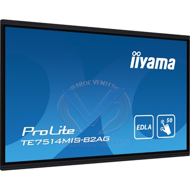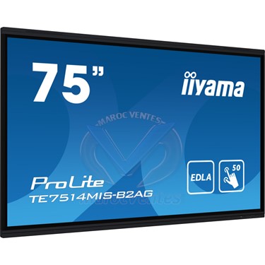 Écran interactif de 75 pouces certifié Google EDLA pour une intégration et une collaboration transparentes dans l'enseignement et l'entrepriseLe TE7514MIS-B2AG est un écran interactif visionnaire 4K UHD Certifié Google EDLA qui établit une nouvelle norme en matière d'ingéniosité et de performance. Fabriqué avec précision, il est doté d'un écran LCD à zéro écart d'air qui élimine la parallaxe, ainsi que de la technologie précise PureTouch-IR+ avec rejet de la paume de la main, garantissant une interaction transparente. Alimenté par iiWare 12E avec Android 13 et équipé d'une connectivité WiFi, il s'intègre sans effort dans votre écosystème, soutenu par la plateforme de gestion des appareils iiyama (DMS).Découvrez des capacités de partage sans fil inégalées grâce à l'application intuitive iiyama Share et EShare, facilitant un brainstorming transparent et une collaboration efficace au sein de votre entreprise ou de votre établissement d'enseignement.Avec son interface 4K innovante et ses profils utilisateurs personnalisables, le TE7514MIS-B2AG offre une expérience personnalisée, permettant un accès facile aux applications sur mesure et aux disques durs du Cloud. Adapté pour prospérer dans les environnements hybrides, il devient une solution sur mesure pour les divers besoins des utilisateurs, révolutionnant la collaboration, la communication et l'engagement.Transformant les lieux de travail modernes, les domaines éducatifs et les espaces de réunion dynamiques, cet écran est un élément essentiel favorisant le progrès et la connectivité au-delà des frontières.Caractéristiques Techniques