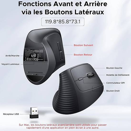 CONFORT EXCEPTIONNEL La conception ergonomique de cette souris verticale assure un angle naturel de 57° entre votre bras et votre poignet, prévenant ainsi la fatigue. C'est pourquoi elle est idéale pour les internautes et les utilisateurs d'ordinateurs travaillant de longues heures.CONTRÔLE PRÉCIS Cette souris sans fil 2,4 GHz dispose de 4 niveaux de DPI (1000/1600/2000/4000). Vous pouvez choisir le DPI adapté à votre utilisation ou à la résolution de votre écran pour un contrôle optimal.LIBERTÉ SANS FIL La souris verticale UGREEN offre une portée maximale de 10 m, vous libérant ainsi des contraintes des câbles.Large compatibilité : via la bande 2,4 GHz, vous pouvez vous connecter aux appareils Windows (7/8.1/10/11), macOS (10.15 et versions ultérieures), iOS (13.4 et versions ultérieures), iPadOS (14.0 et versions ultérieures), Android (5.0 et versions ultérieures), Chrome OS ou Linux.Conçu pour le confort : ce produit mesure 119,8 x 85,8 x 73 mm (longueur x largeur x hauteur) et pèse 105 g, idéal pour les grandes mains de 17 cm et plus.Remarque : En mode Mac, le bouton latéral avant permet de passer à l’application suivante (Commande + ]) et le bouton latéral arrière permet de revenir à l’application précédente (Commande + [).Adoptez une nouvelle posture de travail et libérez-vous des douleurs au poignet. La souris sans fil Ugreen Vertical M571 Ergonomique 2.4GHz est conçue pour offrir un confort optimal grâce à son angle naturel de 57°, réduisant la fatigue lors d’une utilisation prolongée. Idéale pour le bureau ou le télétravail, elle propose 4 niveaux de DPI réglables jusqu’à 4000 DPI pour un contrôle précis et fluide. Sa connexion sans fil 2.4GHz assure une portée stable jusqu’à 10 mètres, compatible Windows, macOS, Android et plus. Performante, ergonomique et pensée pour les grandes mains, elle améliore votre productivité avec efficacité et libertéCaractéristiques Techniques