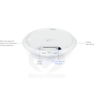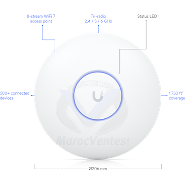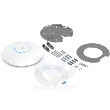 Profitez d'une connectivité sans interférences grâce à son support 6 GHz et préparez-vous à l'avenir avec la fonctionnalité Multi-Link Opération (MLO) à venir. Idéal pour les espaces professionnels, cet accessoire allie puissance et praticité.AperçuDimensions Ø206 x 46 mm (Ø8.1 x 1.8")WiFi Standard WiFi 7Spatial Streams 8Coverage Area 160 m² (1,750 ft²)Max. Client Count 500+Uplink 2.5 GbEMounting Ceiling, Wall (Pro Mount Included)Power Method PoE+PerformanceMIMO6 GHz 2 x 2 (DL/UL MU-MIMO)5 GHz 4 x 4 (DL/UL MU-MIMO)2.4 GHz 2 x 2 (DL/UL MU-MIMO)Max. Data Rate6 GHz5.8 Gbps (BW320)5 GHz8.6 Gbps (BW240)2.4 GHz688 Mbps (BW40)Antenna Gain6 GHz 5.9 dBi5 GHz 6 dBi2.4 GHz 4 dBiMax. TX Power6 GHz 23 dBm5 GHz 29 dBm2.4 GHz 23 dBmMax. BSSIDs 8 per RadioSupported Data Rates802.11be (WiFi 7):6 GHz: 7.3 Mbps to 5.8 Gbps (MCS0 - MCS13 NSS1/2, EHT 20/40/80/160/320) 5 GHz: 7.3 Mbps to 8.6 Gbps (MCS0 - MCS13 NSS1/2/3/4, EHT 20/40/80/160/240)802.11ax (WiFi 6/6E)7.3 Mbps to 4.8 Gbps (MCS0 - MCS11 NSS1/2/3/4, HE 20/40/80/160)802.11ac (WiFi 5)6.5 Mbps to 3.4 Gbps (MCS0 - MCS9 NSS1/2/3/4, VHT 20/40/80/160)802.11n6.5 Mbps to 600 Mbps (MCS0 - MCS31, HT 20/40) - Plus d'images (6)