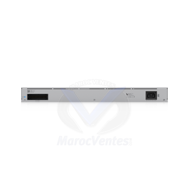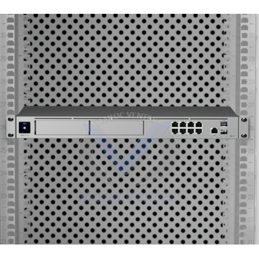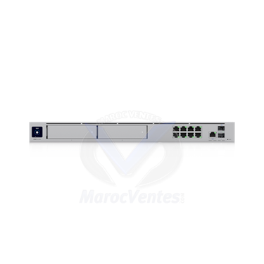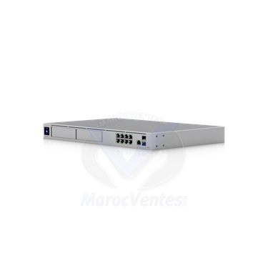 Caractéristique techniqueManaged UniFi Devices 200+Managed Cameras (50) HD(25) 2K(15) 4KManaged Access Hubs 150Simultaneous Users Connected 2,000+Max. WAN Port Count 8Default WAN Ports (1) 10G SFP+(1) 2.5 GbE RJ45Port Layout1 GbE RJ45 8(1G/100M/10M)2.5 GbE RJ45 1(2.5G/1G/100M/10M)10G SFP+ 2(10G/1G)IDS/IPS Throughput 5 GbpsForm Factor Rack mount (1U)Redundancy Shadow Mode (VRRP)Gateway FailoverDC Power BackupHardwareNVR Storage (2) 3.5" NVR HDD baysBuilt-in 128 GB SSD for Faster ExperienceMax. Power Consumption 60WPower Method (1) Universal AC input, 100—240V AC, 2A Max., 50/60 Hz(1) USP-RPS DC input, 11.5V DC, 8.7APower Supply AC/DC, internal, 100WSupported Voltage Range 100—240V ACProcessor Quad-core ARM® Cortex®-A57 at 2.0 GHzSystem Memory 8 GBOn-board Storage 32 GB eMMC128 GB SSD (Integrated)Weight 4.7 kg (10.4 lbEnclosure Material Aluminium CNC, SGCC steelMount Material SGCC steelLCM Display 1.3" touchscreenManagement EthernetBluetooth - Plus d'images (5)