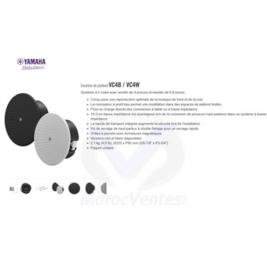 Série Yamaha VC : installation plus sûre et plus rapideInstallation plus sûre et plus rapideLes enceintes de plafond de la série VC sont dotées de boîtiers arrière discrets, d'un poids léger et de caractéristiques mécaniques qui contribuent à une installation nettement plus sûre et plus rapide. De plus, de grandes pinces de montage avec des bandes antidérapantes garantissent un montage sécurisé.RapideSérie Yamaha VC : rapideLes vis à double filetage utilisées pour le mécanisme de serrage du haut-parleur permettent de serrer les pinces deux fois plus vite que les vis conventionnelles.Peut être peintSérie Yamaha VC : pouvant être peinteLes grilles fournies peuvent être peintes de n'importe quelle couleur pour s'adapter à la décoration intérieure.LégerSérie Yamaha VC : légèretéLe poids réduit augmente la flexibilité d’installation tout en allégeant la charge du personnel d’installation.PortableSérie Yamaha VC : PortableUne « bande de transport » intégrée permet non seulement de transporter facilement l’enceinte, mais augmente également la sécurité lorsque vous travaillez sur un escabeau.* VC8B, VC8W, VC6B, VC6W, VC4B, VC4W uniquementHi-Z ou Lo-ZSérie Yamaha VC : Hi-Z ou Lo-ZLes connexions à haute et basse impédance sont prises en charge et la puissance des haut-parleurs peut être facilement modifiée même après l'installation. - Plus d'images (4)