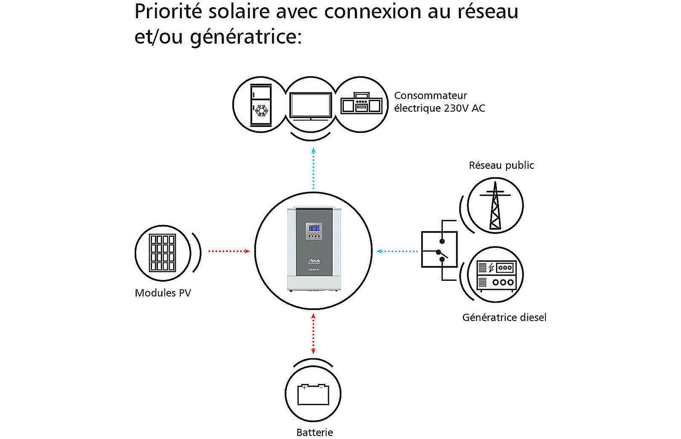 Onduleur hybride Solarix PLI 5000-48 - STECALe système Steca Solarix PLI a été conçu pour répond à vos besoins énergétiques. L'onduleur hybride Solarix PLI 500-48 est une solution tout-en-un qui à la particularité d'être simple dans son utilisation. En fonction de mode d'alimentation utilisé, sa configuration est rapide et intelligente.L'onduleur hybriqde Onduleur hybride Solarix PLI 5000-48 vous permet d’alimenter vos appareils en courant alternatif 230 V et de charger la batterie avec un régulateur de charge MPTT intégré tout en autorisant simultanément le raccordement à un générateur ou au réseau électrique existant.Les avantages de l'Onduleur hybride Solarix PLI 5000-48- un bon rapport qualité / prix- une utilisation simple grâce à : une navigation intuitive un écran graphique LCD 3 témoins LED et un ensemble de fonctions électroniques de protection : protection contre la surcharge de la batterie, contre le courant inverse la nuit ou une alarme acoustique- une capacité de surcharge double permettant le démarrage d'appareillages difficiles ( gros moteurs) même cas de mauvais temps afin de charger la batterie de manière optimale tout en alimentant les appareils raccordés- intégration de la technologie « Maximum Power Point Tracker » dans le régulateur de charge permettant aux modules PV de fournir le maximum de puissance.CARACTERISTIQUES ELECTRONIQUES