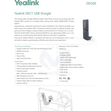 Dongle USB DECT pour les SIP-T41S et T42SLe dongle DD10K Yealink DECT permet au T41S / T42S de fonctionner simultanément avec le système Yealink DECT en tant que combiné après l’appariement avec la station de base Yealink W60B DECT IP.Soutenue par un débit de transmission puissant de 552 kbit / s, cette solution vous fournit une connexion DECT rapide et fiable, sans câblage ni problèmes de câblage, et vous donne le privilège de bénéficier de communications sans fil en quelques minutes. En complément de la série DECT Yealink, la connexion du DD10K à votre téléphone de bureau vous offre une nouvelle solution en combinant les fonctionnalités du téléphone de bureau avec les capacités DECT. De plus, Yealink DD10K est conforme aux normes CAT-iq 2.0 et son déploiement est simple et sûr, garantissant une expérience utilisateur flexible et optimale.Caractéristiques techniques :