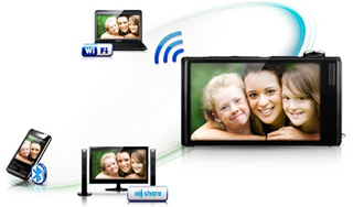 Envoyez un autoportrait délirant à vos amis, mettez en ligne une photo de votre père en train de faire quelques pas de dance sur Youtube, ou visionnez vos clichés favoris sur le grand écran de votre téléviseur. Pour faire tout ça rien de plus simple. Envoyez vos photos et vidéos sur un téléphone portable (grâce à la fonctionnalité Bluetooth). Utilisez le Wi-Fi pour les envoyer par email, ou les mettre en ligne directement sur Picassa, Facebook, Youtube ou samsungimaging.com. Et grâce à sa technologie sans fil ALLShare, vous pouvez gérer, regarder et partager facilement vos photos et vidéos sur votre téléviseur (s’il est compatible avec la technologie DLNA).