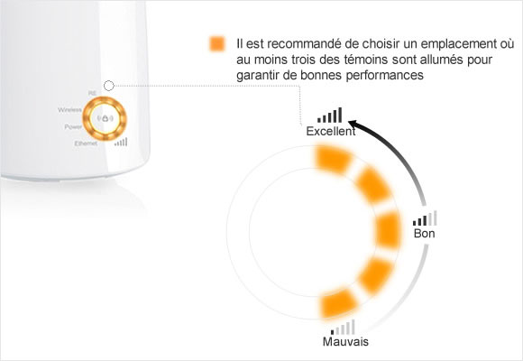 Les 5 indicateurs lumineux représentent la puissance de signal reçue par le TL-WA850RE, ce qui aide à trouver la position idéale pour placer l'extenseur de portée. Ainsi, le TL-WA850RE peut fournir la meilleur couverture et de meilleurs performances au réseau.
