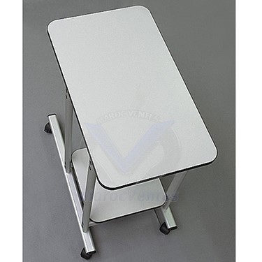 Table professionnelle multi-projection avec deux étagères pour le projecteur, l'ordinateur portable ou l'imprimante. Le dessus est en panneau de meuble de couleur grise. La base en aluminium argenté est mobile grâce aux roues verrouillables.ST007