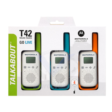 Talkies-walkies PMR446 idéal pour les loisirsExtrêmement simple d'utilisation et offrant des conversations entièrement gratuites, le talkie-walkie T42 convient à une application occasionnelle, pour vos loisirs en plein air, en famille et entre amis.Communiquez avec vos interlocuteurs avec jusqu'à 4 km de distance, sur 16 canaux différents. L'appairage est d'une simplicité enfantine, vous pouvez alors profiter d'appels de groupe ainsi que de la fonction SCAN permettant de chercher automatiquement les canaux disponibles à proximité et la fonction monitor, offrant alors une utilisation semblable aux babyphones. Des stickers de personnalisation sont fournis afin de styliser vos talkies-walkies à votre convenance.Profitez de votre Motorola T42 durant plus de 18 heures grâce à ses trois piles AAA (non fournies). Ce nouveau talkie-walkie va devenir votre meilleur ami et celui de votre entourage, il ne présente aucun danger pour les plus jeunes et fait retomber en enfance les plus grands.Caractéristiques Techniques :