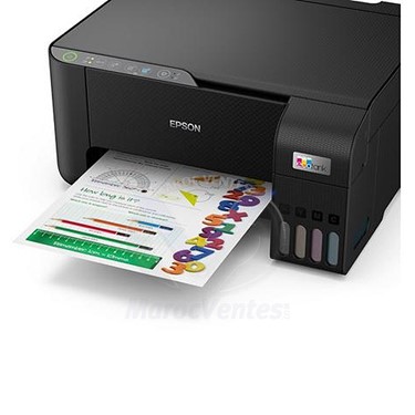Consommation d’énergie12 W (copie autonome, norme ISO/IEC 24712), 0,7 W (mode veille), 4,5 W Prêt, 0,2 W (éteindre), TEC 0,15 kWh/weekGamme de tension/ Fréquence nominaleAC 220 V - 240 VDimensions du produit375 x 347 x 179 mm (Largeur x Profondeur x Hauteur)Poids du produit3,9 kgSystèmes d’exploitation compatiblesMac OS X 10.6.8 or later, Windows 10, Windows 7, Windows 8, Windows 8.1, Windows Server 2008 (32/64 bits), Windows Server 2008 R2, Windows Server 2012 (64bit), Windows Server 2012 R2, Windows Server 2016, Windows Vista, Windows XP Professional x64 Edition SP2 or later, Windows XP SP3 or later (32-bit), Windows Server 2003 R2, Windows Server 2003 SP2 or laterConnexionsUSB, Wi-Fi, Wi-Fi DirectServices d'impression mobile et via le cloudEpson Connect (iPrint, Email Print, Remote Print Driver), Epson Smart Panel AppContenu de la BoîteQuatre bouteilles d’encre individuelles de 65 ml (N,C,J,M) + 1 bouteille d’encre noire supplémentaire, Pilote et programmes d’aide (CD), Appareil principal, Câble électrique, Instructions de montage, Document de garantieCouleurNoirAutres paramètres :